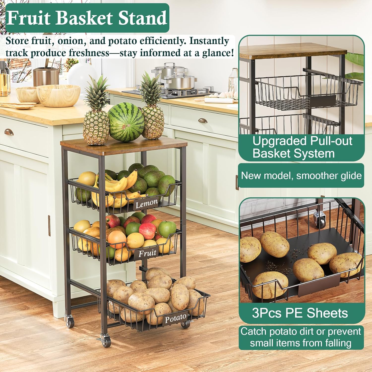 Need more counter space in your kitchen? Our all-purpose small kitchen 4 tier fruit stand is perfect for storing and organizing fruits and vegetables. It also can be used for small appliances and kitchen essentials, making it a versatile and convenient addition to any home. This rolling pantry cart can be placed next to or under pantry shelves, adding extra storage for snacks, spice jars, bread, soda, cans, and more. It’s also an ideal spot for pet food and supplies. The 4-tier fruit basket design features pull-out baskets with chalk labels for easy organization, great for vitamins, and meds. Built with an upgraded, sturdy framework from heavy gauge alloy steel and rustic brown board, it’s durable, stable, and coated with a BPA-free, food-safe finish. Stay organized and maximize your space with this handy kitchen cart for small spaces. Note: Please measure before purchasing, as it may not fit under certain pantry shelves.