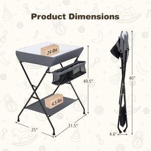 This Grey Folding Wide Nursery Diaper Baby Changing Table is a convenient baby changing station for new parents. Built with a specific height design, this baby diaper changing table requires no bending down to change diapers, give massages, or dress your little bundle of joy. This portable changing table is equipped with a 3-compartment storage basket and a lower storage shelf, great for diaper storage, tissues, small baby toys, and other items. The waterproof and smooth PVC fabric is easy to clean. Has a height ruler and safety belt on the top surface to offer higher security for your baby. Made of a heavy-duty steel frame and wear-resistant 600D canvas fabric, this changing table has great stability and can be used for a long time. Besides, this baby diaper table can be easily folded and placed against a wall or behind a door when not in use.