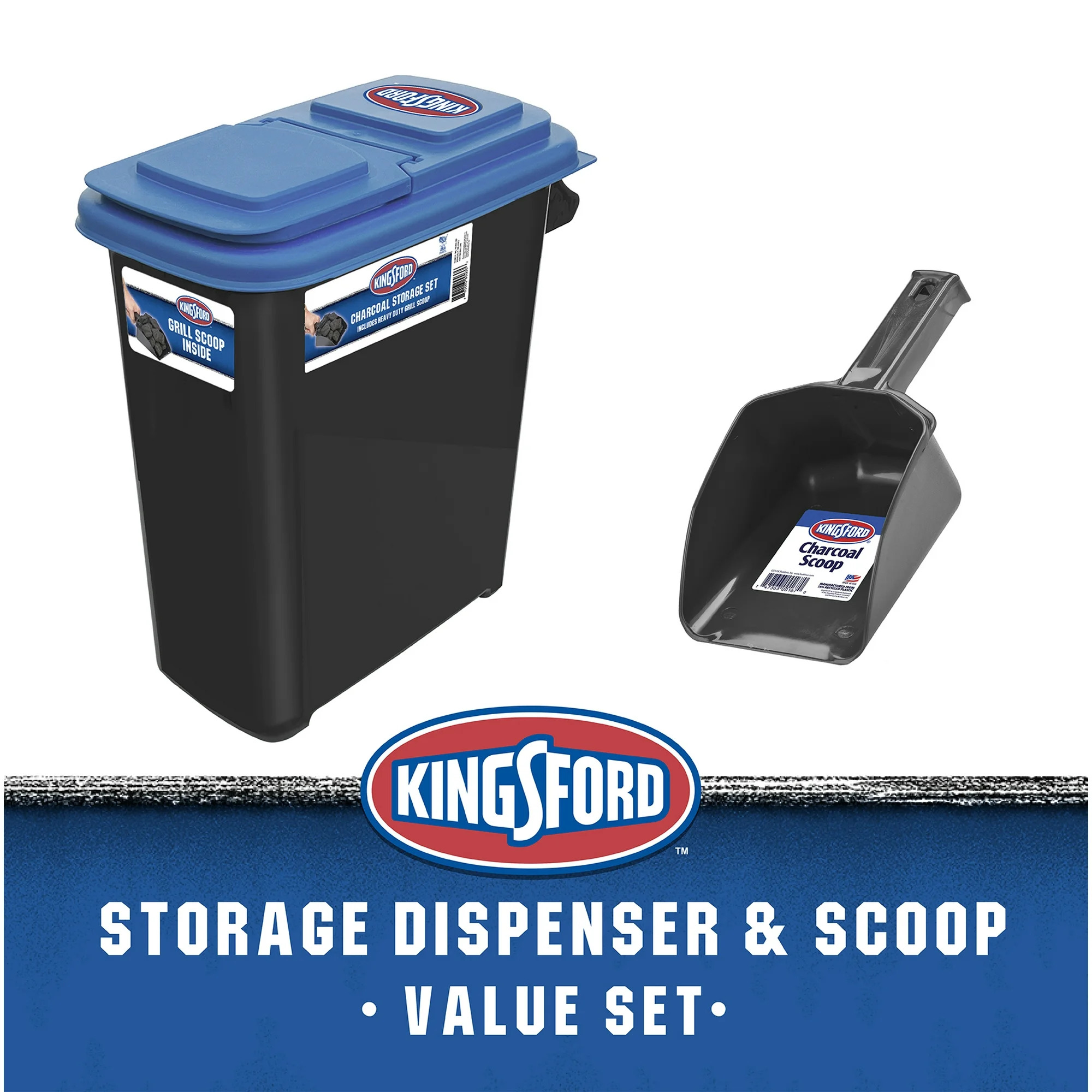 The Kingsford charcoal caddy dispenser in black with blue lid is a must-have for any grilling enthusiast. This dispenser is designed to make the process of handling charcoal convenient and mess-free. With a generous capacity of up to 24 lbs. and measuring 11″ x 19″ x 20″, it ensures you have an ample supply of charcoal for your grilling sessions. The sturdy construction and secure lid help keep the charcoal dry and ready for use. The dispenser’s 8-gallon size strikes the perfect balance between storage capacity and portability, making it easy to transport and store.